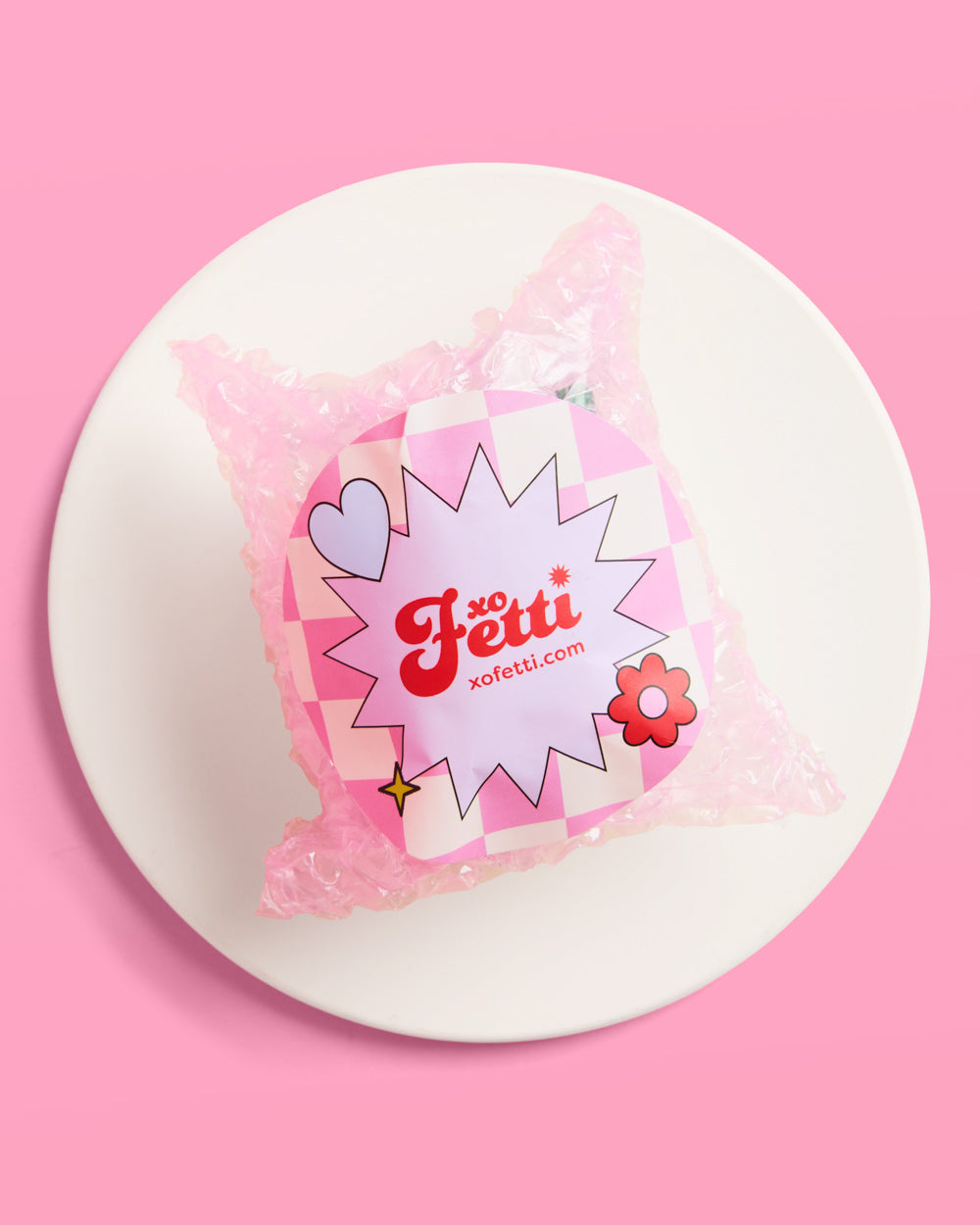 Comes ready to party - simply hang with attached green and pink velvet ribbons