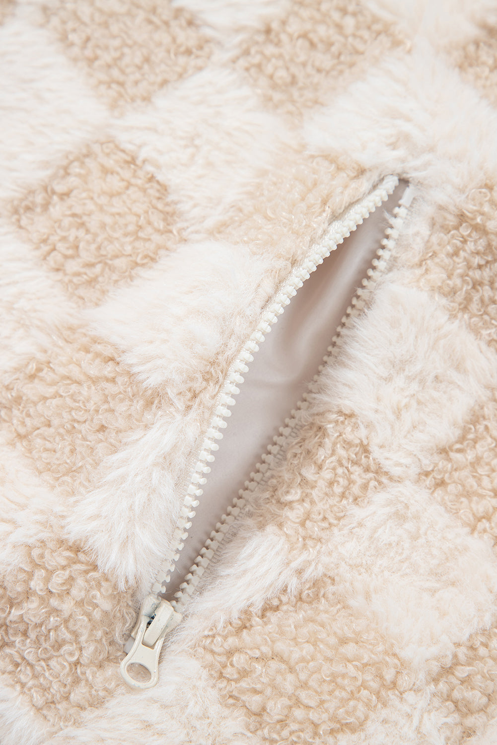 Meet Emily Zip Up Collared Jacket—effortless, flattering, and easy to style for everyday life. Stay cozy and stylish in this Sherpa Jacket. It’s fashionable with a playful checker pattern. Contrast corduroy detailing and zip up design. Convenient pockets design is functional and decorative. Jacket for any fashionable adventure. Material: 100%Polyester.