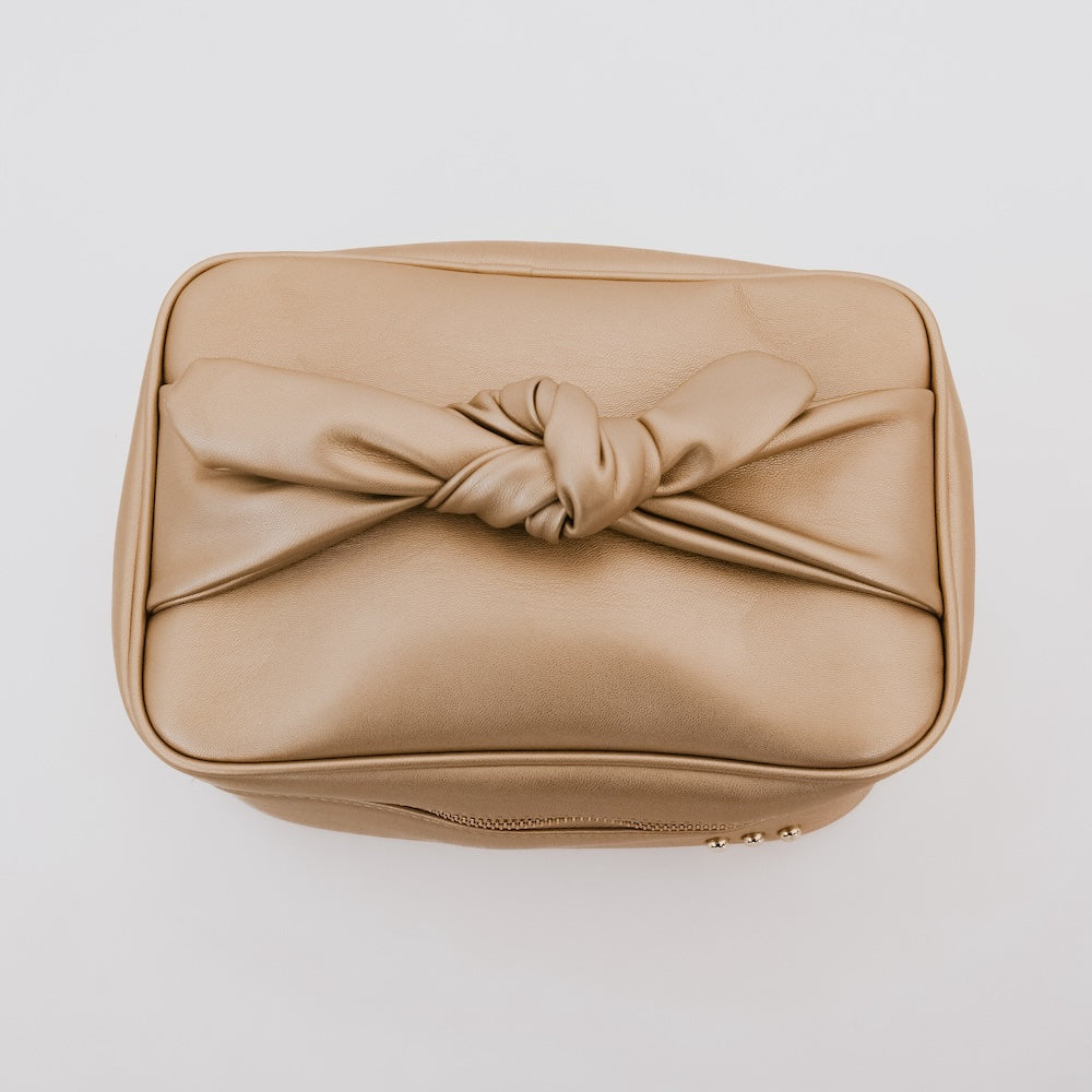 Introducing your new BFF - our Madelyn Bow Makeup Bag! Available in gold, this makeup bag has plenty of room for all your beauty products, hair essentials, and more. Plus, there's a zipper pocket with a compact mirror for on-the-go touch-ups. Perfect for stylish travelers and it's easy to clean too!