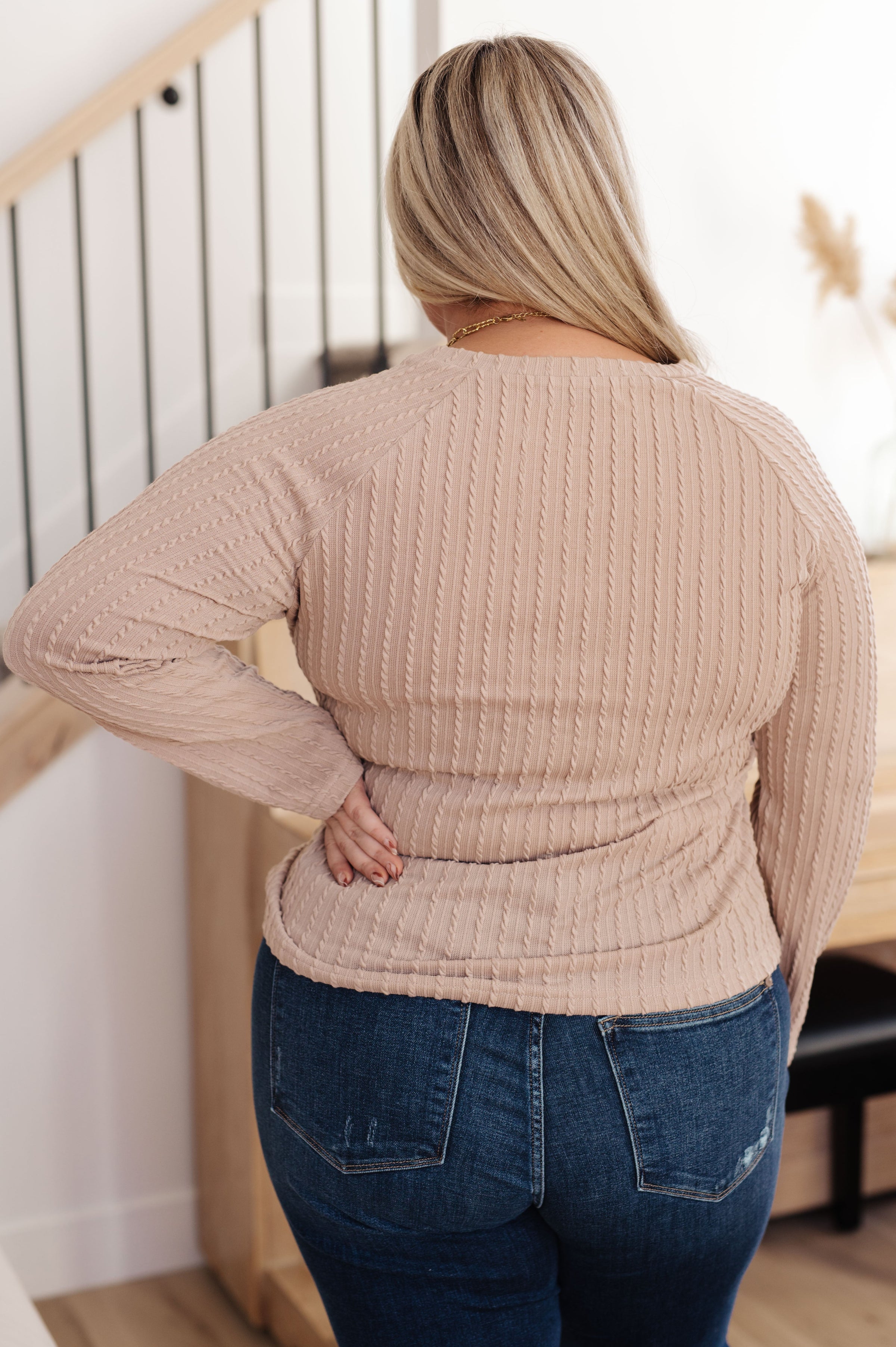 Soothe your senses in this Winding Down Cable Detail Top. A textured knit with raglan sleeves and round neckline will keep you feeling comfortable and stylish. Enjoy the luxurious softness of this timeless piece.