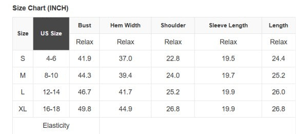 See size chart for approximate measurements